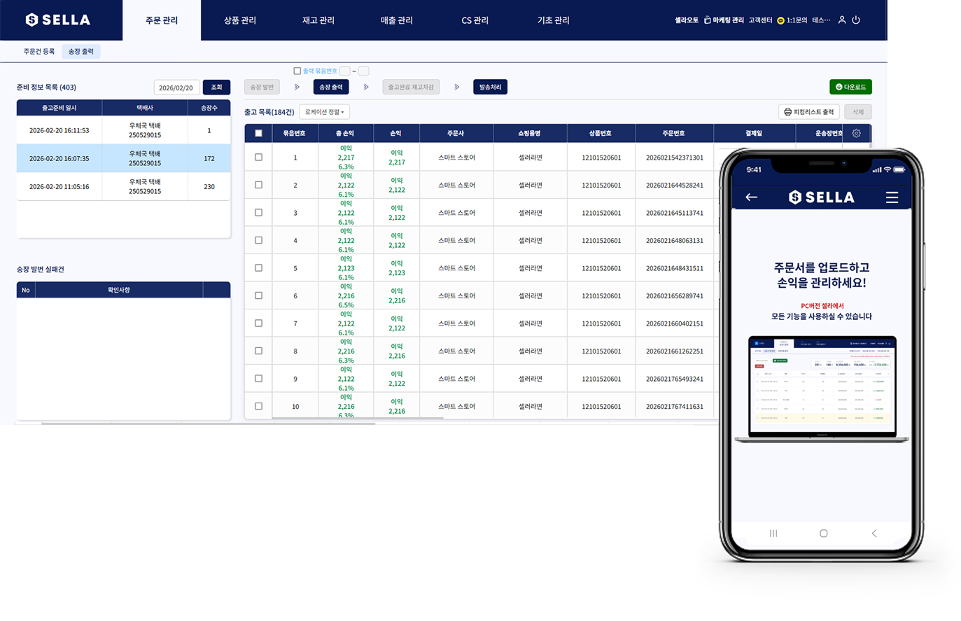 수집된 주문건의 운송장을 출력하고, 발송처리를 할 수 있습니다.